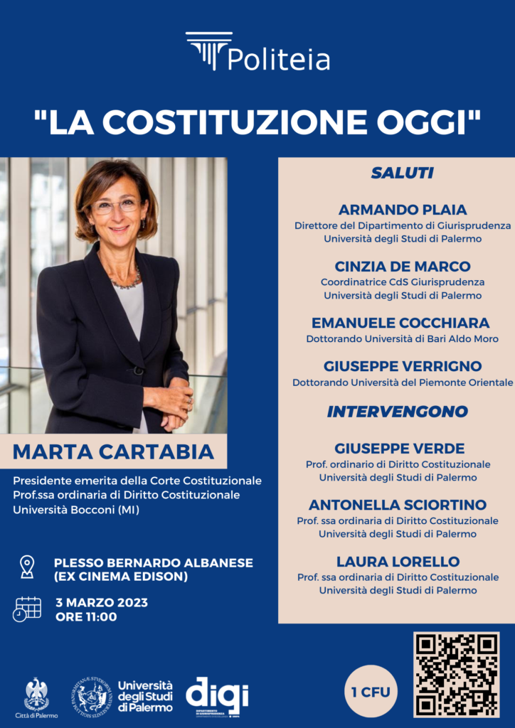 L’evento si terrà a partire dalle ore 11.00 nei locali del Plesso Bernardo Albanese (ex Cinema Edison) del Dipartimento di Giurisprudenza dell’Università degli Studi di Palermo. Verrà inoltre attribuito 1 CFU agli studenti di Giurisprudenza partecipanti.