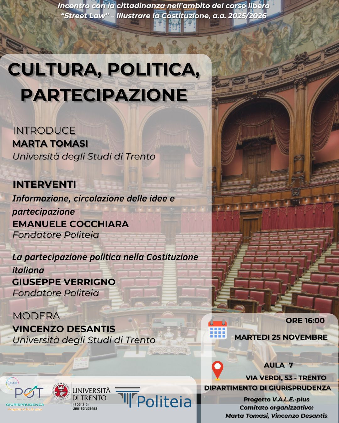 Martedì 25 novembre, su invito dell’Università degli Studi di Trento, si è tenuto un incontro con gli studenti universitari e delle scuole della città. L’incontro, che è stato organizzato nell’ambito del corso “Street law” e della cattedra di diritto costituzionale, ha avuto a oggetto le differenti forme di partecipazione politica previste dalla Costituzione italiana: attraverso i contributi dei relatori, la Professoressa Marta Tomasi e il dottor Vincenzo Desantis dell’Università degli Studi di Trento, e i fondatori dell’associazione, il dottor Emanuele Cocchiara e il dottor Giuseppe Verrigno, si è innescato un profondo dibattito con tutti i presenti.